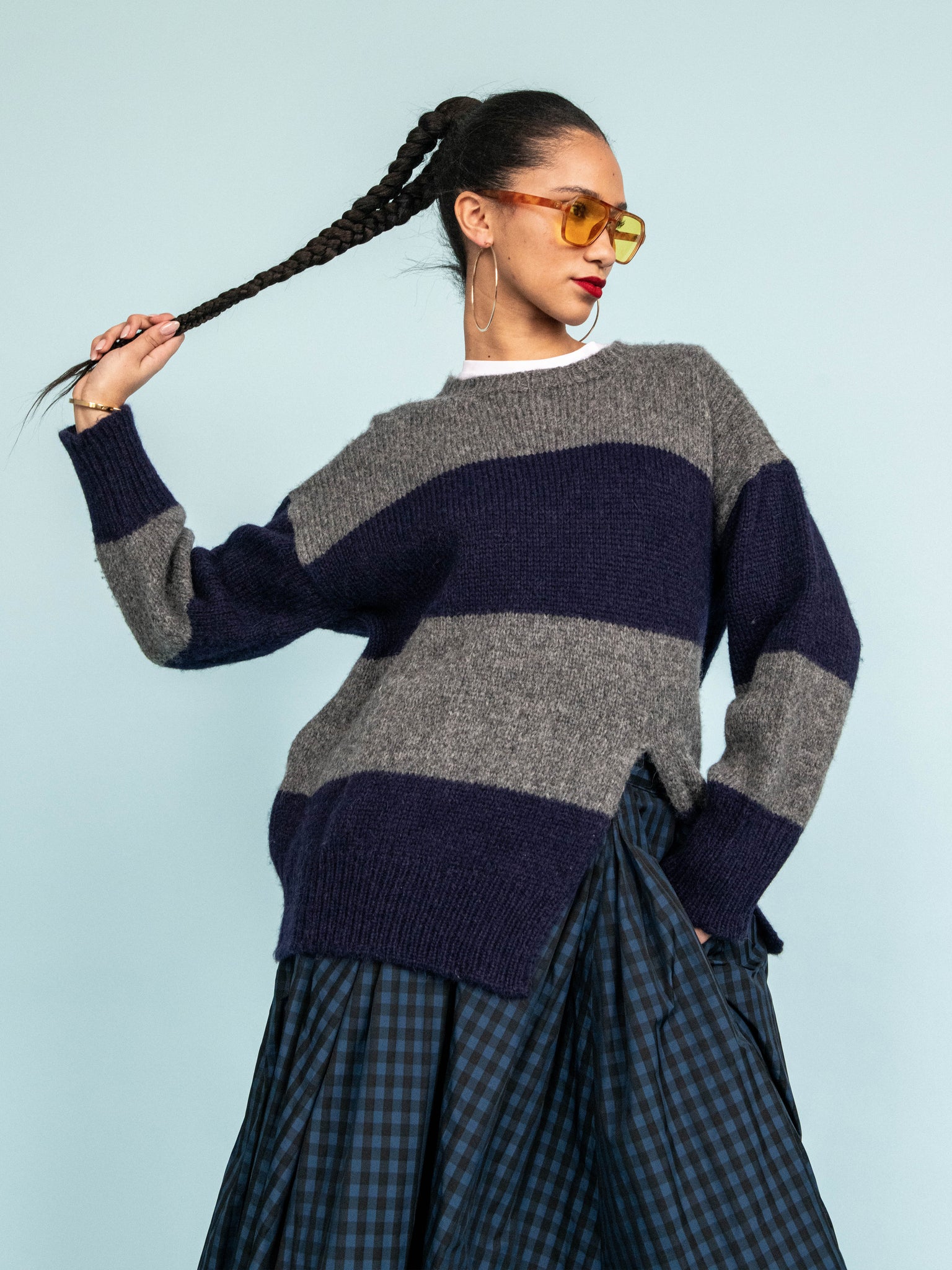 The Striped Crew Sweater in luxuriously soft Baby Alpaca blend yarn is super cozy, lofty and warm. Classic navy and grey stripes get a twist in the form of a slash at the hem, perfect for showing off a layered look.